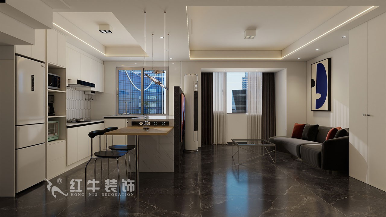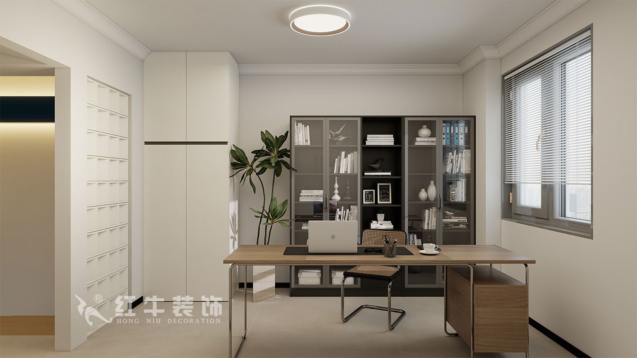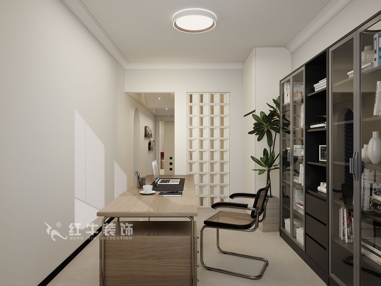 樓上下,通過溝通,一樓不保留衛(wèi)生間的功能,就把餐廚設(shè)計(jì)為一體,利用島臺的半墻做一個(gè)背景墻,完成空間的融合,沙發(fā)和柜子在一個(gè)面,整潔規(guī)整,增大空間感;二樓的書房設(shè)計(jì)開放式的,設(shè)計(jì)中用軟隔斷進(jìn)行分割。