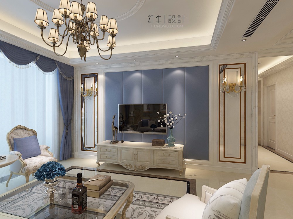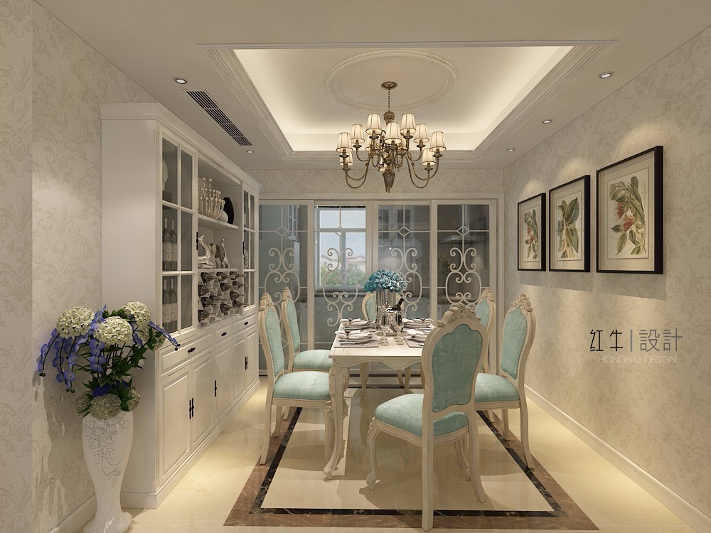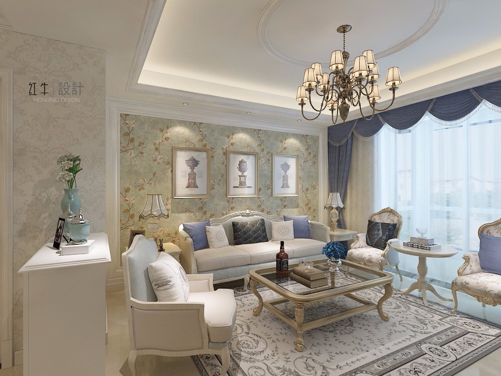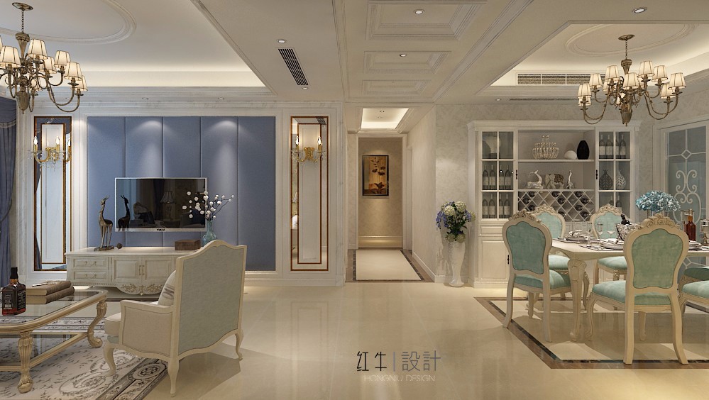 在設(shè)計(jì)的時(shí)候,居室色彩主調(diào)以白色,家具為古典彎腿式,部分家具和門為白色,采用嵌入式石膏吊頂和線條,搭配精致的水晶吊燈,營造出浪漫的感。以磚面作為地面裝飾材料,有很好的光澤感,在沙發(fā)區(qū)鋪上大幅花紋地毯,使空間區(qū)域劃分更加清晰。